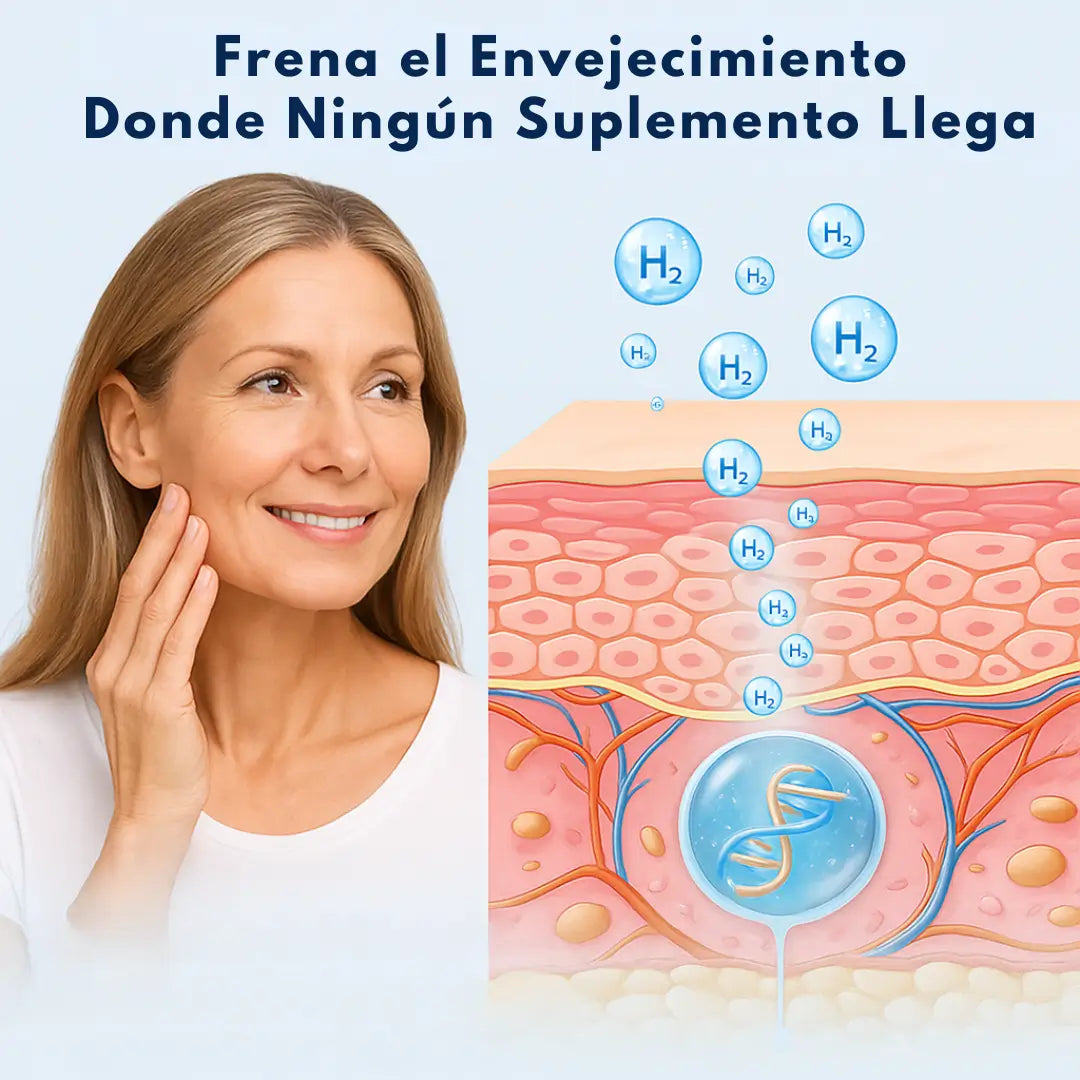 Las moléculas de hidrógeno son tan pequeñas que atraviesan barreras celulares imposibles para otros antioxidantes, protegiendo tu ADN directamente.
